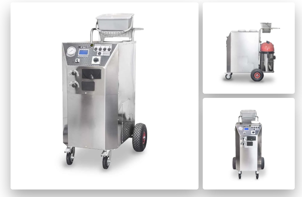 Průmyslový parní čistič s tlakem 10 barů a výkonným vysavačem 1300W v nerezovém provedení.
