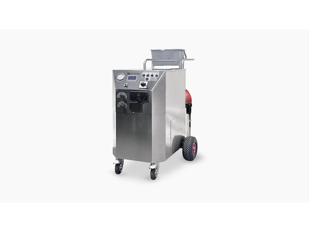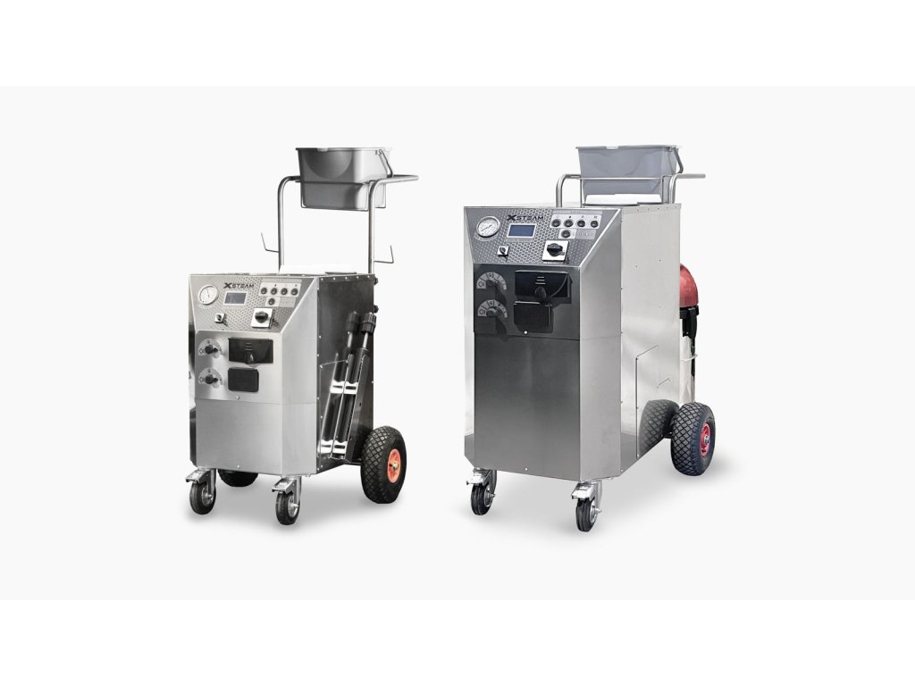 Průmyslový parní čistič s tlakem 10 barů a výkonným vysavačem 1300W v nerezovém provedení.