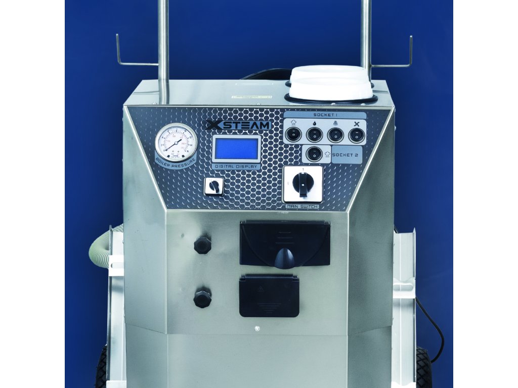 Průmyslový parní čistič s tlakem 10 barů a výkonným vysavačem 1300W v nerezovém provedení.